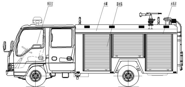 總體布置 | 整車(chē)由消防員乘員室和車(chē)身兩大部分組成,車(chē)身布置采用整體框架式結構,內藏水罐,兩邊為器材箱,后部為水泵房,罐體為平行長(cháng)方體廂式容罐。 |
